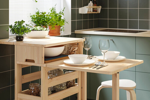 Ya que no todos tenemos la oportunidad de contar con una cocina enorme, nos las tenemos que apañar para tener almacenamiento y espacio de sobra. Muebles y carritos auxiliares se vuelven unos excelentes aliados. Como es el caso de la mesa RESARÖ por 199,00 euros en Ikea, la cual añade almacenaje y zona de trabajo.