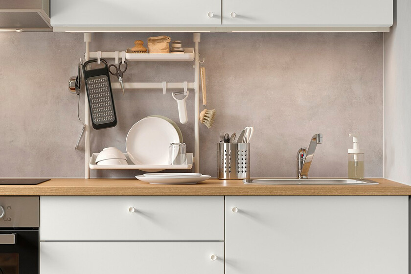 Este accesorio es perfecto para todo tipo de cocinas, sí, pero sobre todo para las pequeñas o escasas de espacio. Después de todo no ocupa casi nada, más bien al contrario, añade almacenamiento para cosas como los utensilios de cocina. Pero también para los accesorios de limpieza básicos como el estropajo y la bayeta.