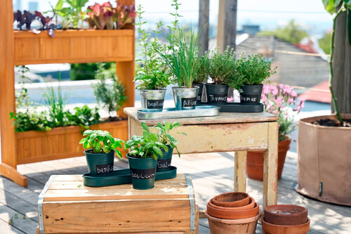 Se trata de unas pequeñas macetas de zinc en las que podremos plantar desde perejil hasta menta e incluso romero o hierbabuena para los mojitos. Incluye una pequeña bandeja que nos permite tenerlos ordenados en un alféizar o sobre una mesita o estantería. De hecho, podríamos tenerlos en la cocina para poder coger una ramita cuando lo necesitemos.