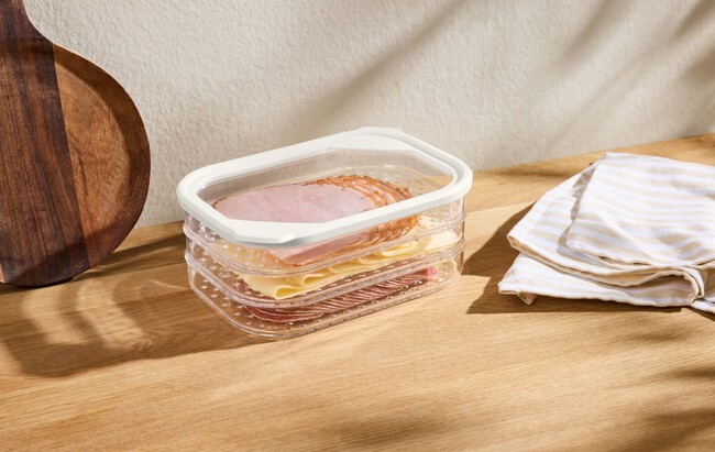 Este tipo de tuppers apilables permite almacenar quesos en lonchas para sándwiches, embutidos e incluso cortes de carne o filetes de pescado que vayamos a consumir pronto para que duren más tiempo frescos. Así podremos almacenarlos en la nevera sin problema y con la tranquilidad de que aguantarán frescos, como recién cortados, más tiempo.