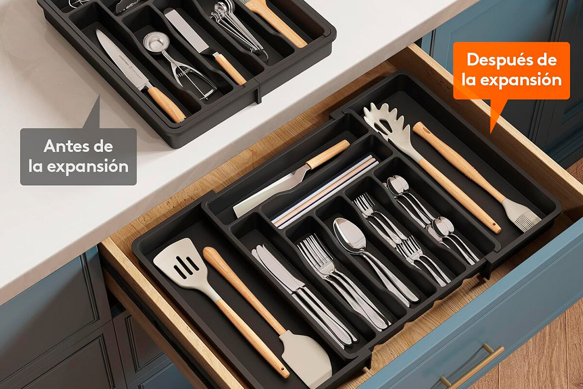 Que los cajones de la cocina se desordenen es de las cosas que más nos pueden atacar los nervios, especialmente si es el de los cubiertos, cuchillos e incluso utensilios de cocina. Para eso se inventaron los organizadores con múltiples compartimentos como este que tenemos en Amazon: es el más vendido y cuesta 19,98 euros.