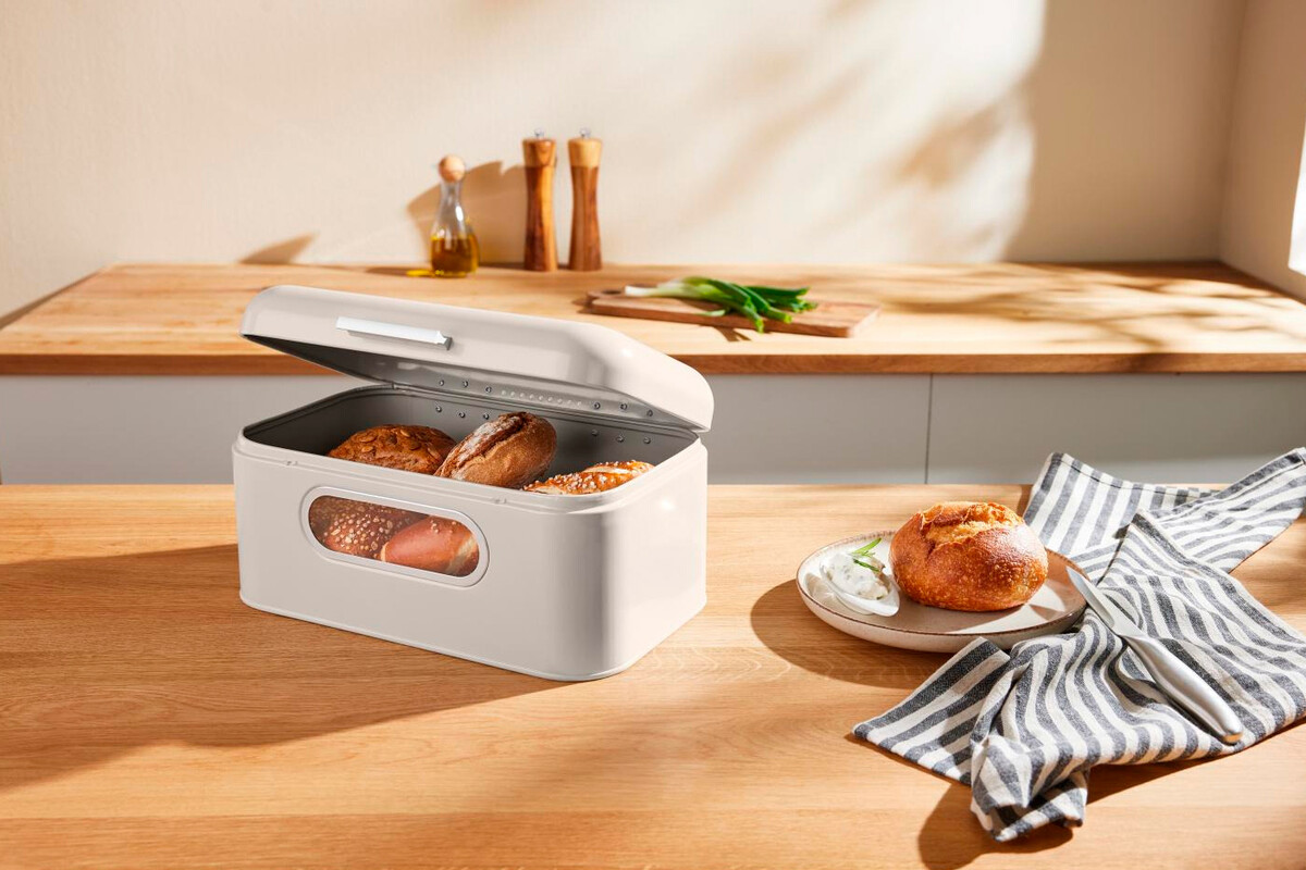 Es ideal para tenerla tanto en la encimera como sobre un carrito auxiliar o dentro de un armario. El asa en la parte frontal de la tapa nos permite abrirla cómodamente e incluso con una mano. A la hora de limpiarla basta con pasarle un paño húmedo y secarla, especialmente antes de llenarla de bollería o pan.