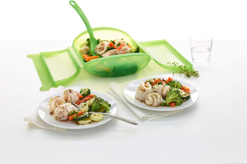 Es sencillo de usar, ya que solo hay que colocar los alimentos en la bandeja extraíble y aliñarlos con aceite y sal, o cualquier hierba aromática. Cerramos el estuche y lo metemos en el microondas unos 10 a 15 minutos. Al crear el conocido efecto papillote, el calor se queda en el interior y los alimentos se cocinan en su propio jugo. Esto hace que mantengan sus nutrientes, vitaminas e incluso la textura intactos.