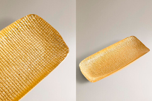 Se trata de una fuente fabricada en vidrio, en intensos tonos dorados y que presenta textura irregular. De hecho a simple vista no parece de vidrio, sino más bien hecha de algún tipo de tejido, pero nada más lejos. Sus acabados son brillantes y muy llamativos, es ligeramente cóncava y podremos poner en ella turrones de todo tipo, pero también polvorones de almendra, bombones y más. Colocada en el centro de la mesa, animará a los invitados a probar cualquier dulce que hayamos puesto en ella.