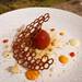 Colocar el bombón encima del crumble, espolvorear un poco del polvo de pimiento deshidratado y terminar colocando la teja de pimiento deshidratado semi apoyada sobre el bombón.