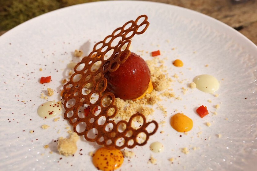 Con el pimiento siempre como protagonista, la tapa juega con contrastes de sabores y texturas. Por un lado, se juega con el dulzor natural de los pimientos del piquillo y el sabor salino del bacalao, potenciado por el punto salado del crumble; por otro, se enfrentan la cremosidad del relleno con las notas crujientes del crumble y la teja de pimiento.