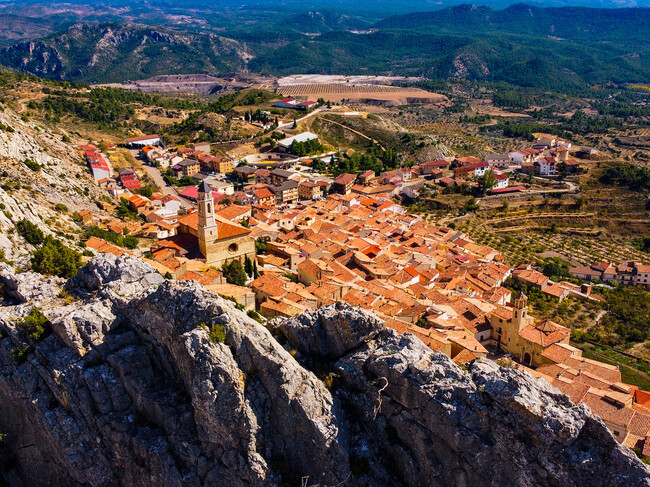 Su casco histórico se organiza en torno a una plaza mayor peculiar: construida sobre arcos de piedra que en los extremos se abren al vacío, dejando ver el barranco que rodea por tres flancos el espolón sobre el que se asienta el pueblo.