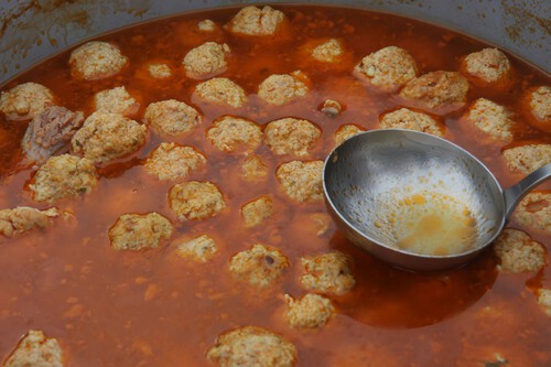 El guiso, por su parte, es muy humilde y sencillo. Lleva una base de pavo o pollo troceado que se sofríe primero aparte antes de dorar en una buena olla unos cuantos dientes de ajo picados. Se reincorpora la carne, se cubre con agua y se echa una picada de almendras y pan frito con azafrán, perejil, sal y más ajos. Finalmente, entran las pelotas a la olla junto con unas patatas peladas y chascadas, para cocinar el conjunto, al menos, durante una hora a fuego lento.