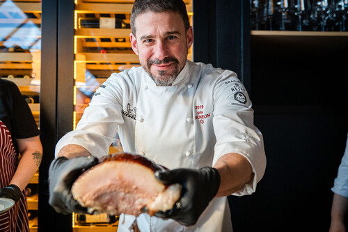 Por eso, Javi Estévez ha configurado un menú competitivo –90 euros por persona– y totalmente tematizado en el cerdo ibérico de Joselito con el que, además, le da por viajar. "La estrella del menú es una cabeza de cerdo que hacemos al estilo Honshu, una técnica china, donde se cuece a baja temperatura con muchas especias como lemongrass, jengibre, anís estrellado… Y luego, esa carne, la ponemos como si fuera un pato a la pekinesa, con unas obleas".