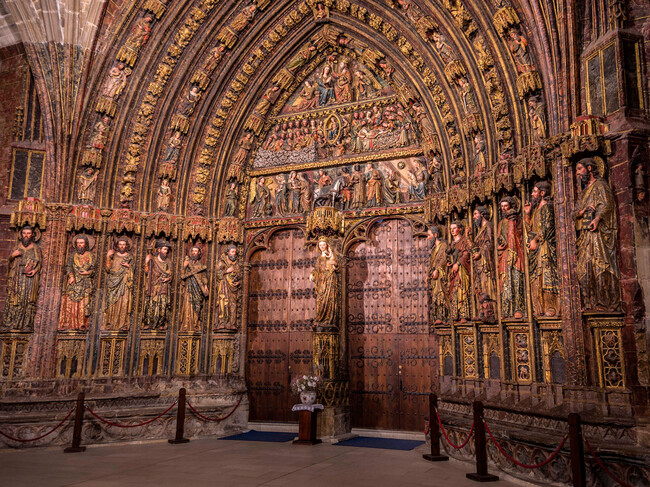 Esta portada, realizada en piedra caliza, se esculpió con una riqueza de formas y figuras que representa escenas bíblicas, santos, ángeles y elementos decorativos propios del gótico final. Lo extraordinario es que, hacia el siglo XVII, alguien tuvo la feliz idea de cubrir completamente el pórtico con una estructura cerrada. Gracias a ese sencillo pero decisivo gesto, las policromías originales han llegado hasta nuestros días prácticamente intactas. Un pequeño milagro arquitectónico.