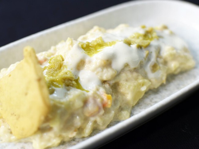“El éxito de nuestra ensaladilla está en asar la patata y en una mayonesa emulsionada con el líquido de los encurtidos, en este caso pepinillos y aceitunas, también un poquito de anchoa”, explica el cocinero. “Con esa misma mayonesa cubrimos y ponemos un picadillo de piparra y pepinillo; terminamos con una emulsión de piparra por encima”.