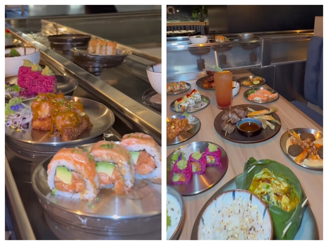 El comensal elige, hace el pedido y espera a que la comida navegue suavemente frente a él, un sistema sencillo que ha convertido el local en un pequeño espectáculo cotidiano.