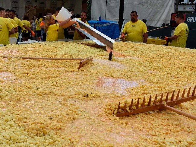 Aunque ese fue un arranque poderoso, lo mejor llegó el domingo. A las once de la mañana, unas setenta y cinco personas se pusieron manos a la obra para cocinar la tortilla de patatas más grande del mundo. Hicieron falta 17.000 huevos, 2.000 kilos de patatas, 300 litros de aceite y treinta kilos de sal, todos reunidos en una sartén de seis metros de diámetro.