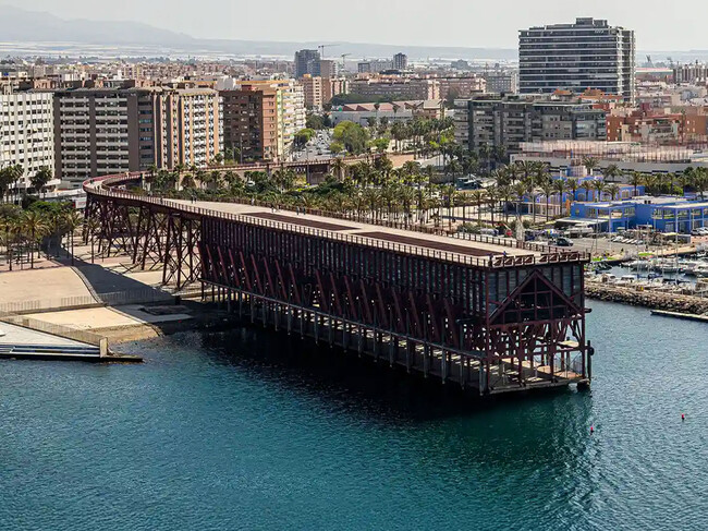 Se encuentra en la playa de las Almadrabillas, junto al muelle de Levante, en pleno corazón del litoral urbano de Almería. Su perfil, elevado y de tonos rojizos, recuerda al esqueleto de una montaña rusa. Pero no hay giros vertiginosos ni vagones de pasajeros. Lo que hay es historia, arquitectura y un legado industrial de primer nivel.
