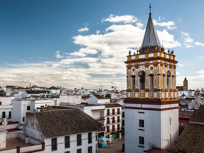 Junto a ella se conservan lienzos de la antigua muralla almohade y una torre exenta que fue el alminar de la primitiva mezquita. Subir a esa torre permite contemplar una panorámica del Aljarafe que justifica por sí sola la visita.