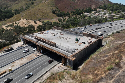Sobre la autopista 101, en Agoura Hills, al noroeste de Los Ángeles, se está levantando un paso elevado pensado para que la naturaleza vuelva a coser dos cordilleras separadas por el tráfico.