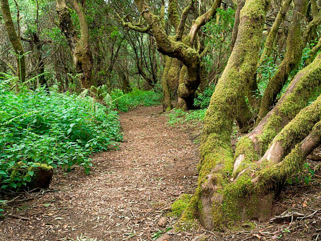La Ruta de La Llanía se encuentra en el municipio de Valverde, en el nordeste de El Hierro. Podemos empezar desde el aparcamiento o fuente de La Llanía, junto a la carretera principal de la isla (HI‑1). El trayecto está bien señalizado con carteles y marcas que indican la SLEH1. Al comenzar, entras en un bosque húmedo de laurisilva y fayal‑brezal, un entorno frondoso lleno de helechos, musgo y líquenes, que recuerda esos bosques ancestrales de cuento.