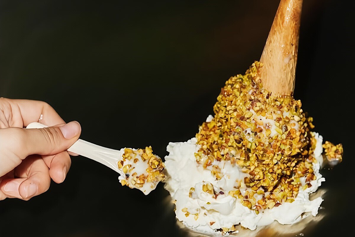 El resultado es un helado cremoso pero más ligero que las versiones convencionales, aunque este se caracteriza por estar rebozados de pistacho picado y por llevar un remate de nata encima del todo.