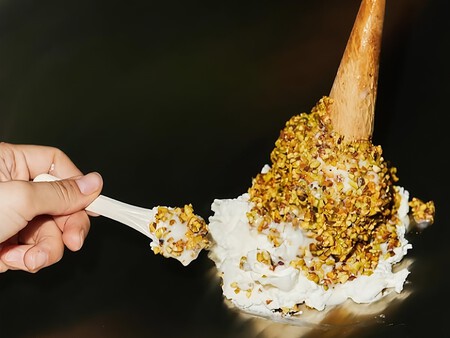 El resultado es un helado cremoso pero más ligero que las versiones convencionales, aunque este se caracteriza por estar rebozados de pistacho picado y por llevar un remate de nata encima del todo.