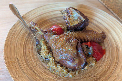 El arroz de Julín merecería, como su croqueta, un texto para él solo: es meloso, entero aún pero bien cocinado, de caldo potente aunque no excesivo; la carne del ave, firme, de cocción larga, mantiene sin embargo toda su jugosidad. El conjunto es de esos que desde el primer bocado te hacen pensar que tienes que volver otro día para repetir. Y esa es la mejor señal, más aún en una zona en la que este plato se elabora con frecuencia, y en muchos casos muy bien.