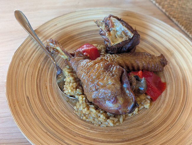 El arroz de Julín merecería, como su croqueta, un texto para él solo: es meloso, entero aún pero bien cocinado, de caldo potente aunque no excesivo; la carne del ave, firme, de cocción larga, mantiene sin embargo toda su jugosidad. El conjunto es de esos que desde el primer bocado te hacen pensar que tienes que volver otro día para repetir. Y esa es la mejor señal, más aún en una zona en la que este plato se elabora con frecuencia, y en muchos casos muy bien.