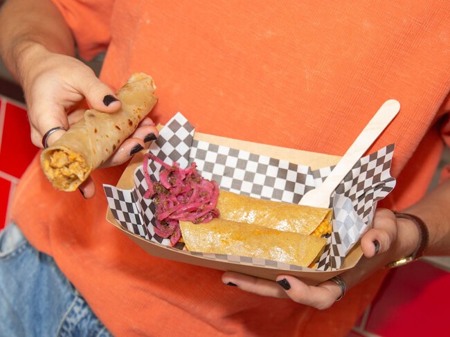 Los tacos al vapor se sirven en tortillas de maíz artesanales que se bañan con un aceite casero de chile una vez rellenos, y se pueden completar con acompañamientos como zanahorias en escabeche, jalapeños o cebolla encurtida. Los burritos al vapor se preparan con tortillas de harina, inspirándose en los clásicos “de hielera” de México, que se dice que caben en un bolsillo para llevarlos a cualquier parte.