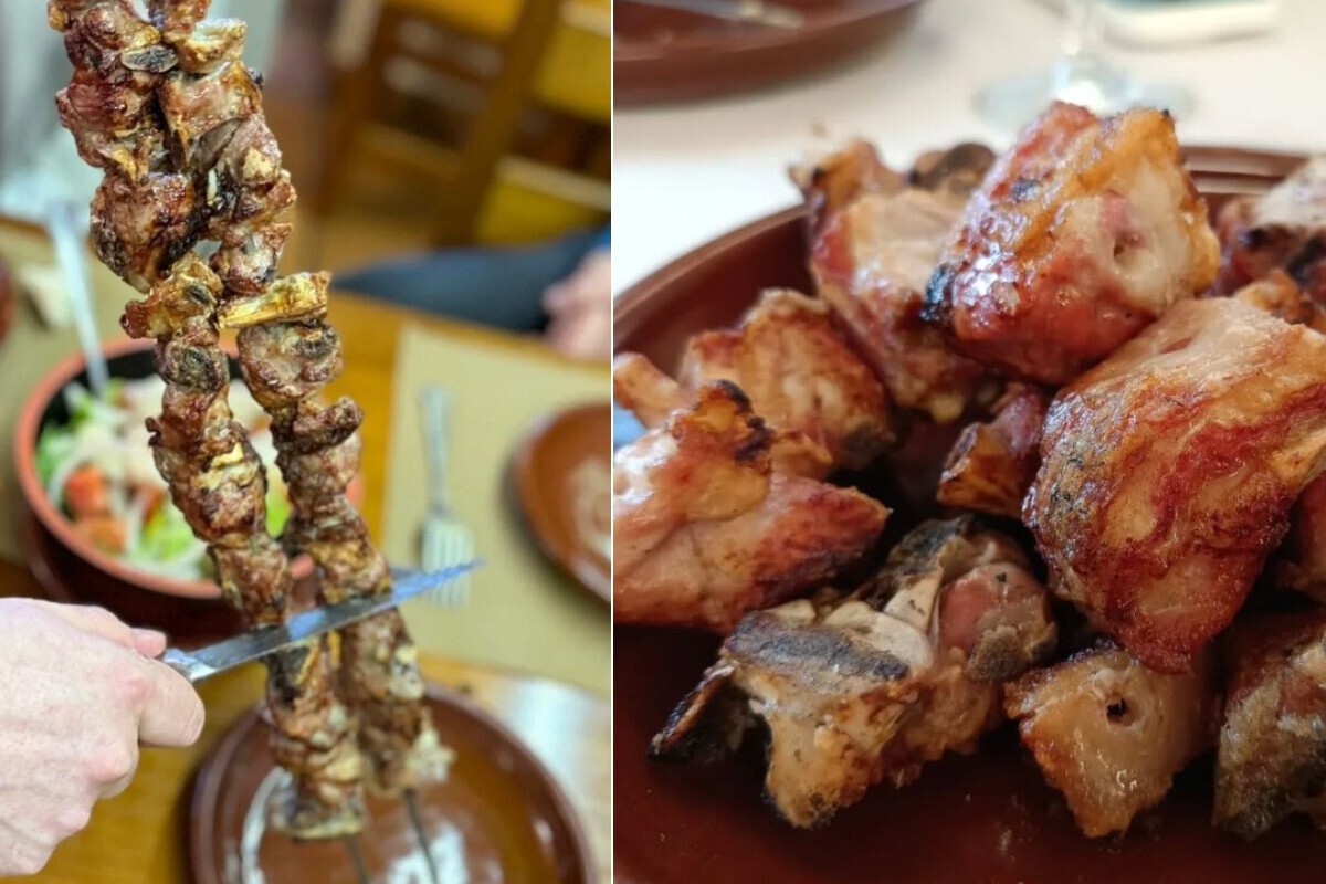 El resultado son grandes pinchos que en crudo pueden cargar con hasta 650 g de peso que, incluso tras la lógica merma del cocinado, plantean un buen reto incluso para estómagos entrenados. Piezas de carne del mismo tamaño, alternando partes magras y con hueso, que se extraen del estoque directamente en la mesa, y que se recomiendan compartir.