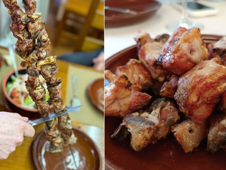 El resultado son grandes pinchos que en crudo pueden cargar con hasta 650 g de peso que, incluso tras la lógica merma del cocinado, plantean un buen reto incluso para estómagos entrenados. Piezas de carne del mismo tamaño, alternando partes magras y con hueso, que se extraen del estoque directamente en la mesa, y que se recomiendan compartir.