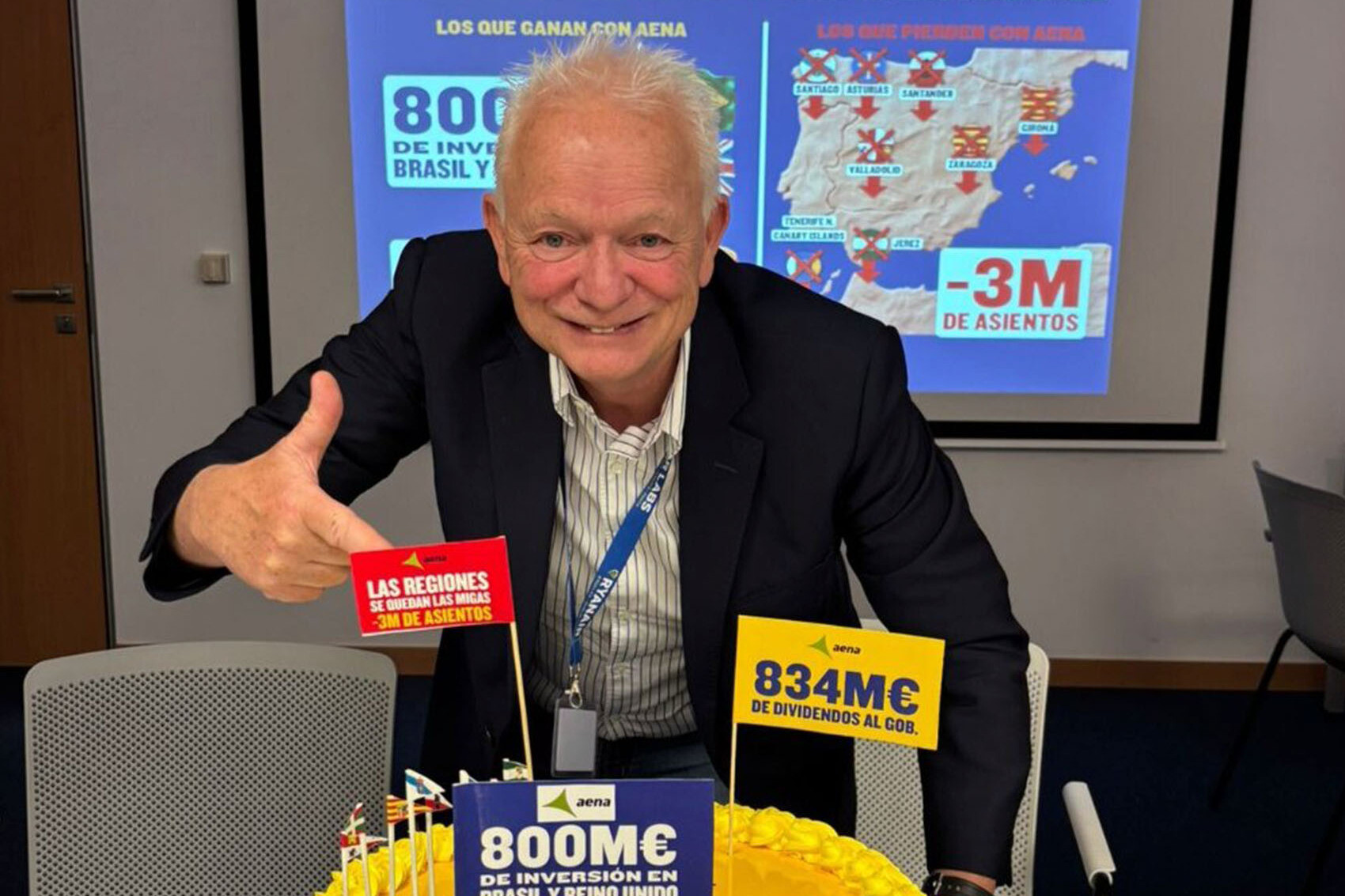 Además, con la sorna habitual de la empresa irlandesa, ha aparecido con un pastel en el que se retrataba el reparto económico de Aena en 2025.