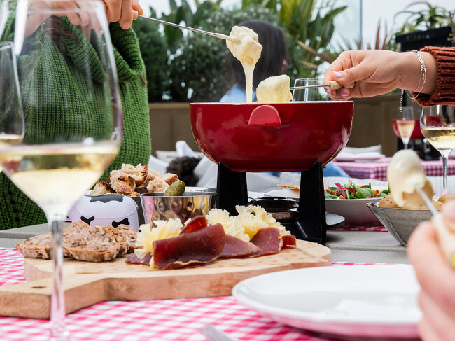Habrá fondue, claro, la clásica moitié-moitié, pero no llega sola. La propuesta de este año incluye, por ejemplo, un bikini hispano-suizo con cecina y queso gruyère o, para amantes de lo original, una fondue al cava, protagonizada por un trío de quesos suizos de primer orden como el gruyère, el vacherin y el tête de moine.