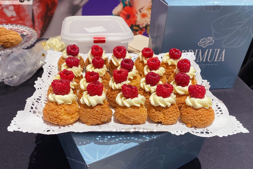 En Prímula sus craquelins los rellenan con mermelada artesanal de frambuesa y crema pastelera de vainilla, para terminar coronándolos con una suave ganaché de chocolate blanco dispuesta con una manga de boquilla rizada. Y el punto final es una frambuesa natural que equilibra con su fresca acidez el dulce del conjunto. Una elaboración simple y a la vez compleja que representa a pequeña escala la esencia de la alta pastelería artesanal francesa.