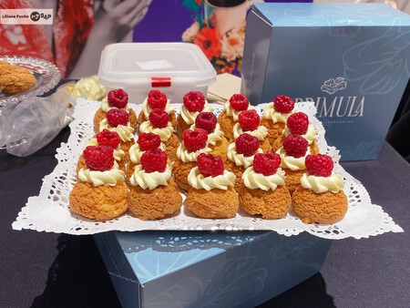 En Prímula sus craquelins los rellenan con mermelada artesanal de frambuesa y crema pastelera de vainilla, para terminar coronándolos con una suave ganaché de chocolate blanco dispuesta con una manga de boquilla rizada. Y el punto final es una frambuesa natural que equilibra con su fresca acidez el dulce del conjunto. Una elaboración simple y a la vez compleja que representa a pequeña escala la esencia de la alta pastelería artesanal francesa.