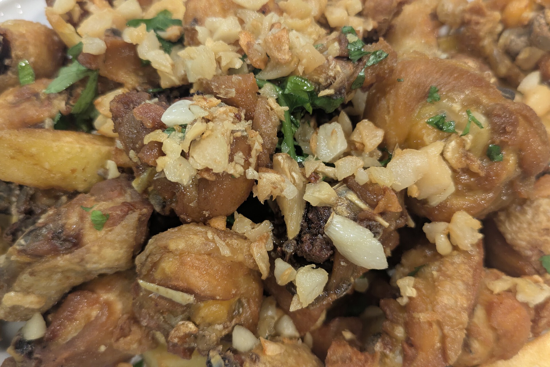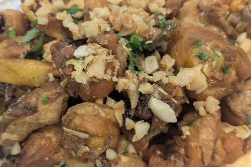 En cualquier caso, hay dos especialidades que no deberías dejar de probar: el jamón asado y el pollo. El primero, que mucha gente conoce como jamón asado al estilo Serafín, es tierno, suave, con una salsa que te va a poner difícil parar de mojar pan. Pero si el jamón asado es bueno, el pollo al ajillo es, probablemente, la seña de identidad más reconocible de la casa. Y lo es con razón. A los pocos minutos de pedirlo llega a la mesa una ración imponente de pollo troceado, bien dorado en la sartén, servido sobre un lecho de patatas fritas y rematado con una dosis generosa de ese ajillo marca de la casa que te hace estar pensando en cuándo vas a volver para pedir otra ración en cuanto te metes la primera porción en la boca.
