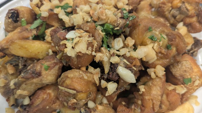 En cualquier caso, hay dos especialidades que no deberías dejar de probar: el jamón asado y el pollo. El primero, que mucha gente conoce como jamón asado al estilo Serafín, es tierno, suave, con una salsa que te va a poner difícil parar de mojar pan. Pero si el jamón asado es bueno, el pollo al ajillo es, probablemente, la seña de identidad más reconocible de la casa. Y lo es con razón. A los pocos minutos de pedirlo llega a la mesa una ración imponente de pollo troceado, bien dorado en la sartén, servido sobre un lecho de patatas fritas y rematado con una dosis generosa de ese ajillo marca de la casa que te hace estar pensando en cuándo vas a volver para pedir otra ración en cuanto te metes la primera porción en la boca.