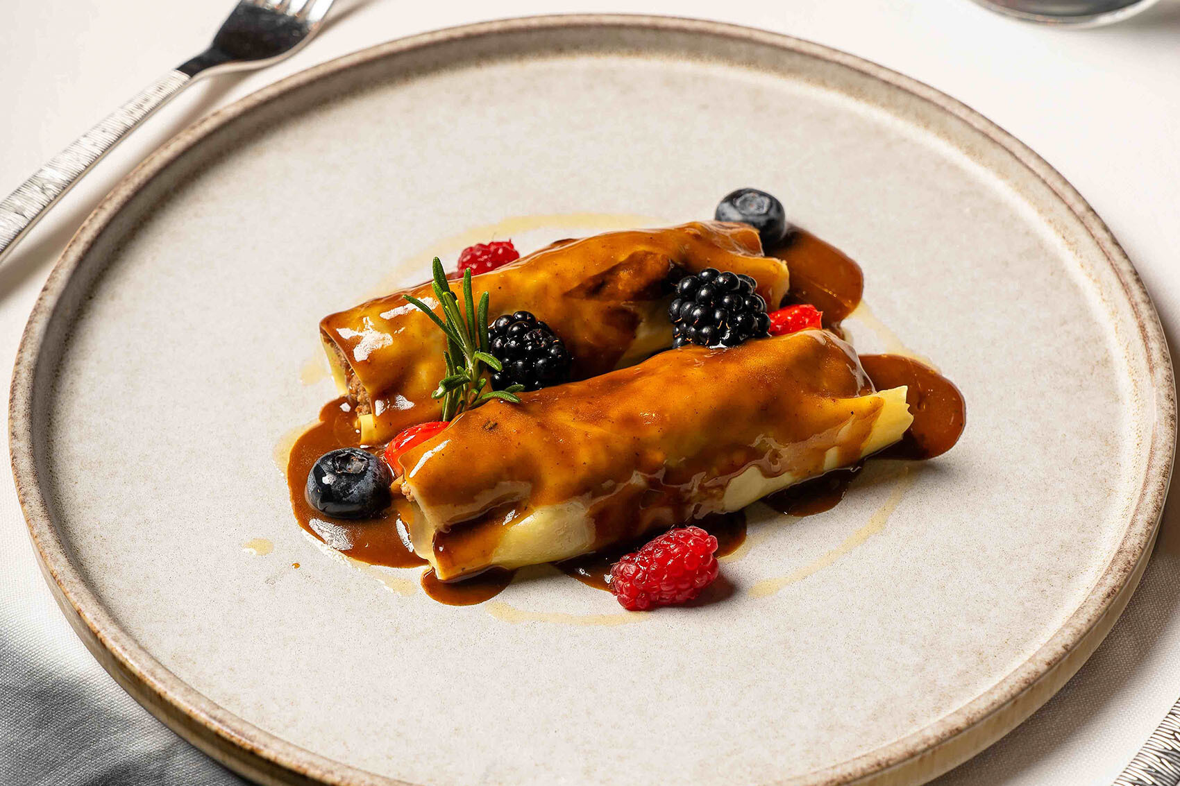 Los canelones de liebre a la royale en dos salsas de Suculent.